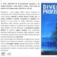 L’impegno gratuito, il lavoro oblativo, il piacere della professionalità seria, della creatività artistica e della ricerca filosofica senza ritorno in termini di royalties edi banconote sonanti, la contemplazione ascetica e la vita spirituale fanno ridere: per essere “qualcuno” occorre avere una nicchia nel tempio del Mercato, e le sole carriere “serie” sono quelle che portano a metter le mani sulla gestione del commercio e della finanza, comprese quelle che piamente provvedono alle opere di religione, garantite dalla profonda devozione alla Santa Bustarella. L’Europa costruita esclusivamente sul denaro e sulle merci, ha basi malferme e impure – come concluderà questa stessa Satira – perché prive di un robusto riferimento etico.