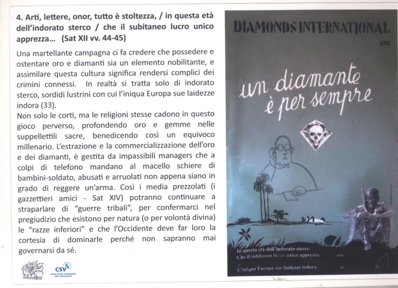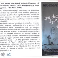 Non solo le corti, ma le religioni stesse cadono in questo gioco perverso, profondendo oro e gemme nelle suppellettili sacre, divinizzando e benedicendo così un equivoco millenario. E con l’oro e i diamanti l’Europa iniqua, ingiusta, copre di lustrini le sue impresentabili vergogne, senza far sapere al gran pubblico che l’estrazione e la commercializzazione dell’oro e dei diamanti avviene in condizioni a dir poco inigieniche e malsane, quando non è apertamente criminogena e sobillata come tale da impassibili managers che la dirigono a colpi di telefono da uffici ovattati e ben refrigerati a migliaia di chilometri di distanza, con l’impiego di truppe mercenarie e mestatori privati che mandano al macello schiere di bambini-soldato, abusati e arruolati non appena siano in grado di reggere un’arma.