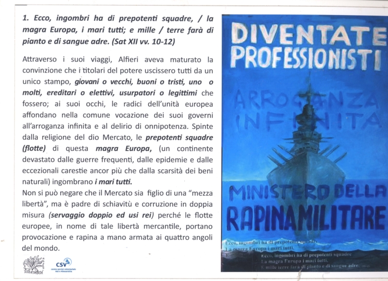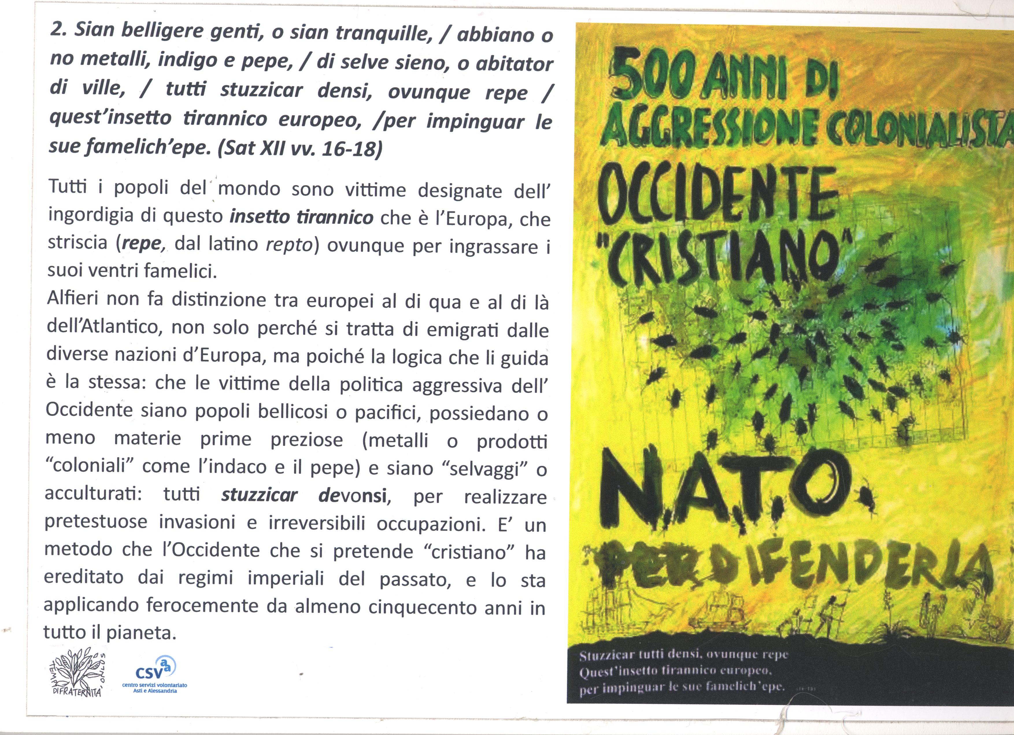 All’esatto contrario di quanto vuol far credere la retorica di regime, Alfieri insegna che il Dio Mercato non costruisce nulla, anzi demolisce quanto di più sacro c’è nel cuore umano, crea gli odi e “vigliaccamente” ci mangia sopra, sostituisce l’amor di patria con l’amor di arricchimento indebito, a costo di spegnere il lume della coscienza morale. E’ chiaro il rapporto tra il mercato delle armi e la società consumista e cialtrona che ingrassa sulla morte dei poveri ma non vuole saperlo..